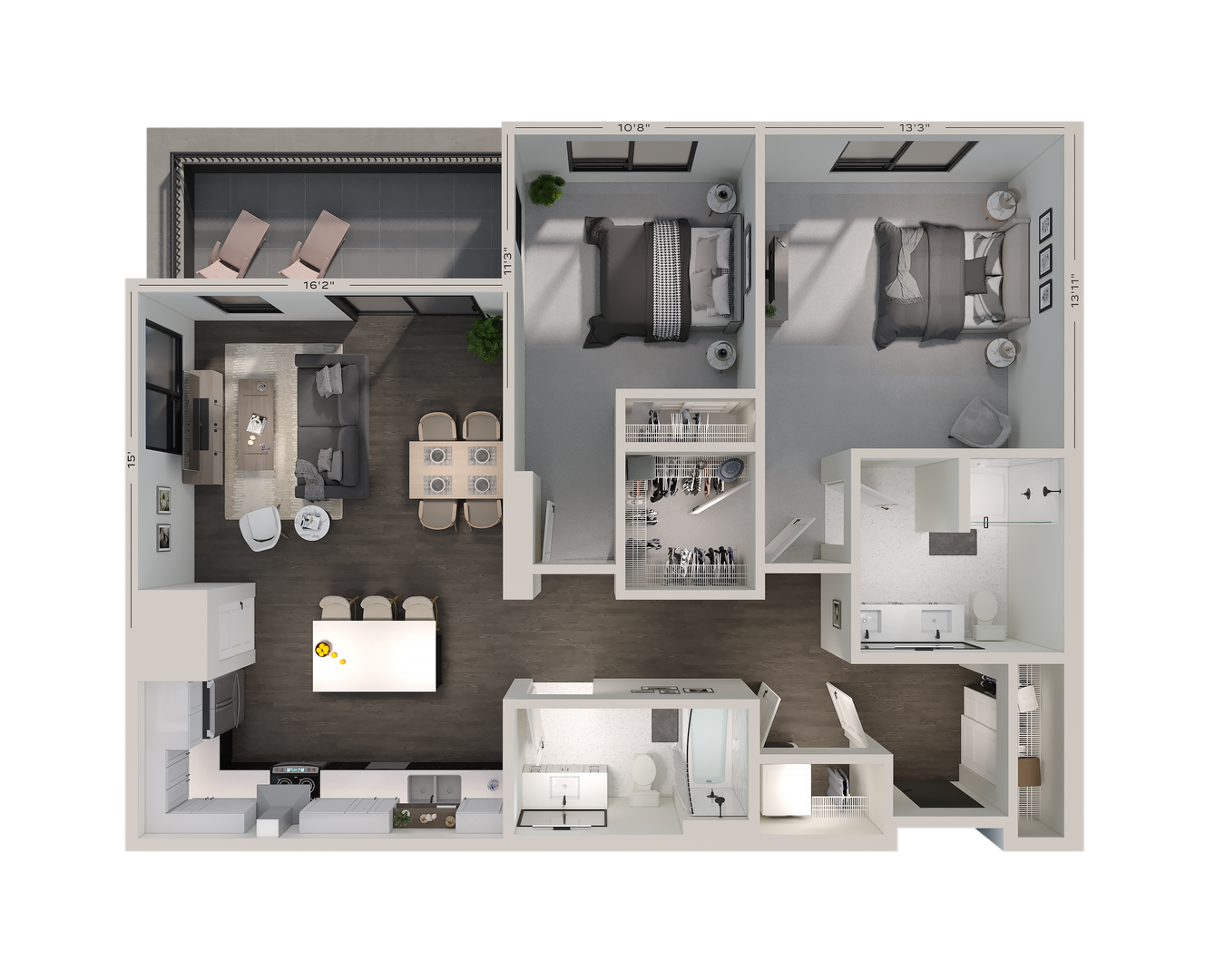 Unwind in sophisticated spaces and enjoy resort-class amenities like a fitness & yoga studio, three rooftop decks, EV charging stations, a complimentary coffee station and 24/7 mini market. First & Banks' studio, 1, 2, and 3-bedroom floor plans were expertly designed to maximize space and create unique layouts, including premier two-story walkout units.