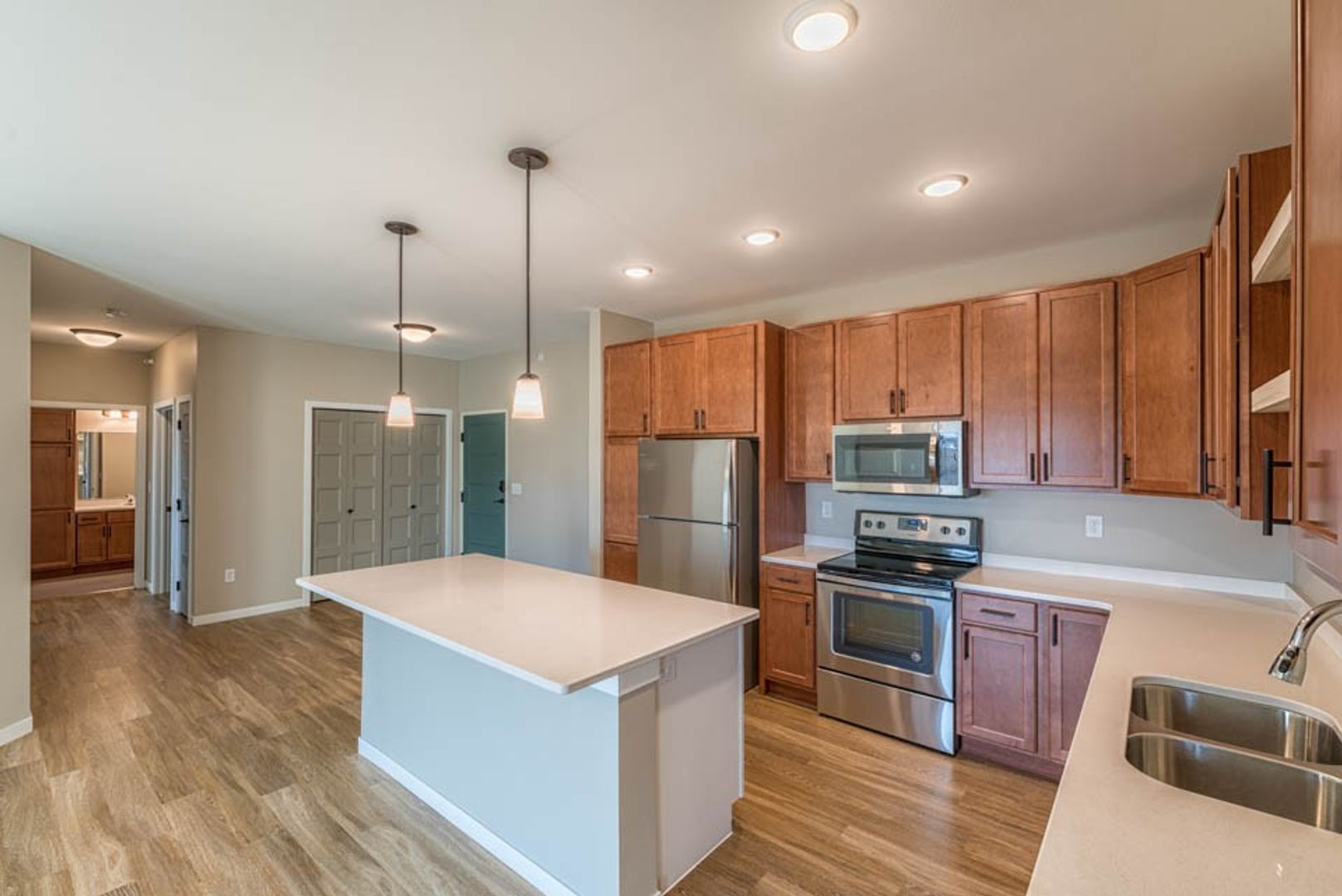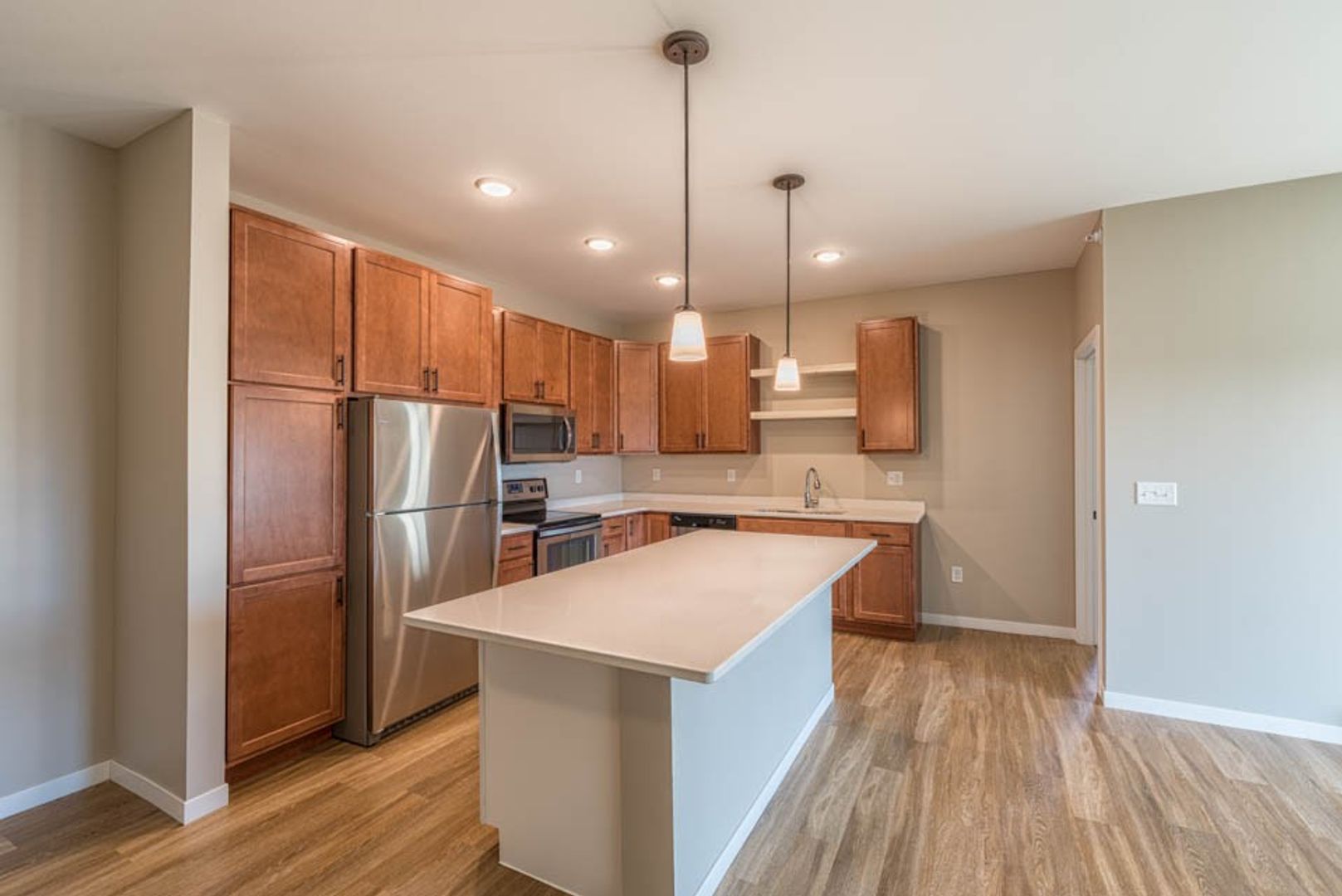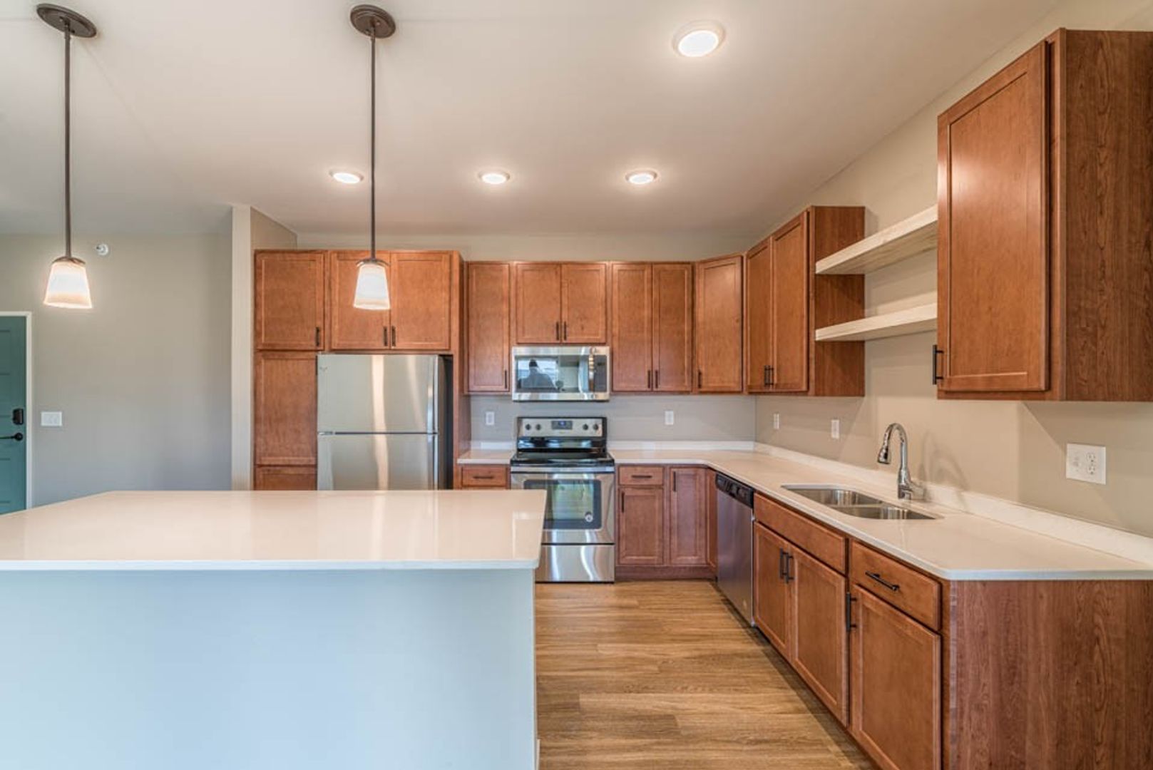 Each unit features pendant lighting, quartz countertops, stainless steel appliances, wood-inspired flooring and an in-home washer and dryer. You'll love the modern, hand-picked finishes. Plus, we're pet-friendly!