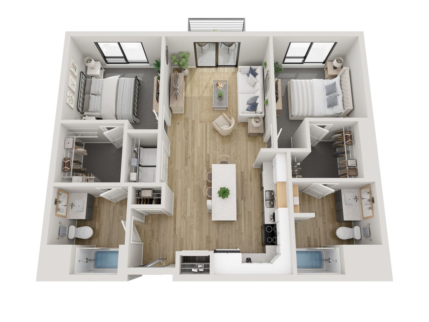 Wild Oak's studio, 1, 2, and 3-bedroom floor plans were expertly designed to maximize space. Each apartment home is filled with natural light, open-concept kitchens and in-home washer and dryer. Upgraded hand-picked finishes include-wood inspired flooring, tile backsplash, and quartz counters that create an upgraded living experience.