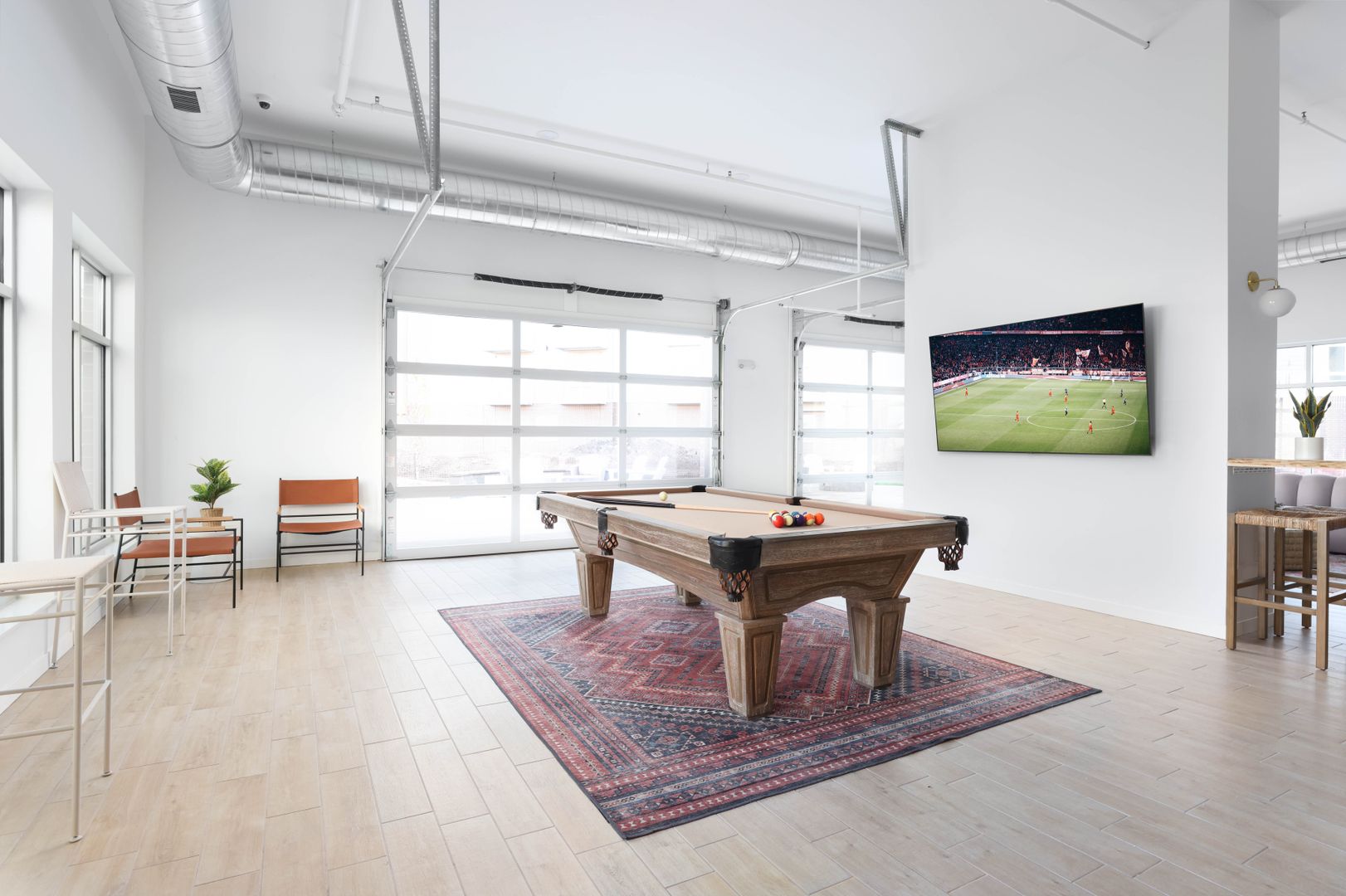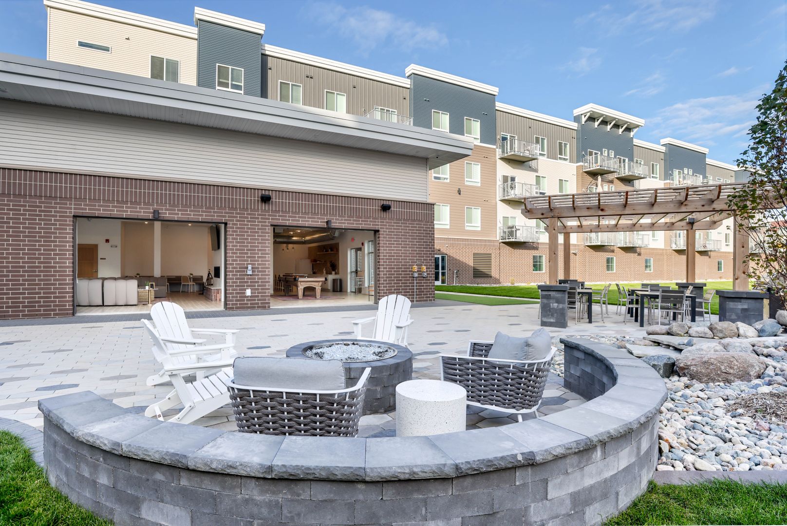 The Retreat features a centrally located clubhouse with conveniences including a fitness studio, full kitchen, entertainment center, and sports simulator. The garage-door style openings in the clubroom bring the outdoors in and open to a patio with grilling stations, a fire pit and ample green space for yard games.