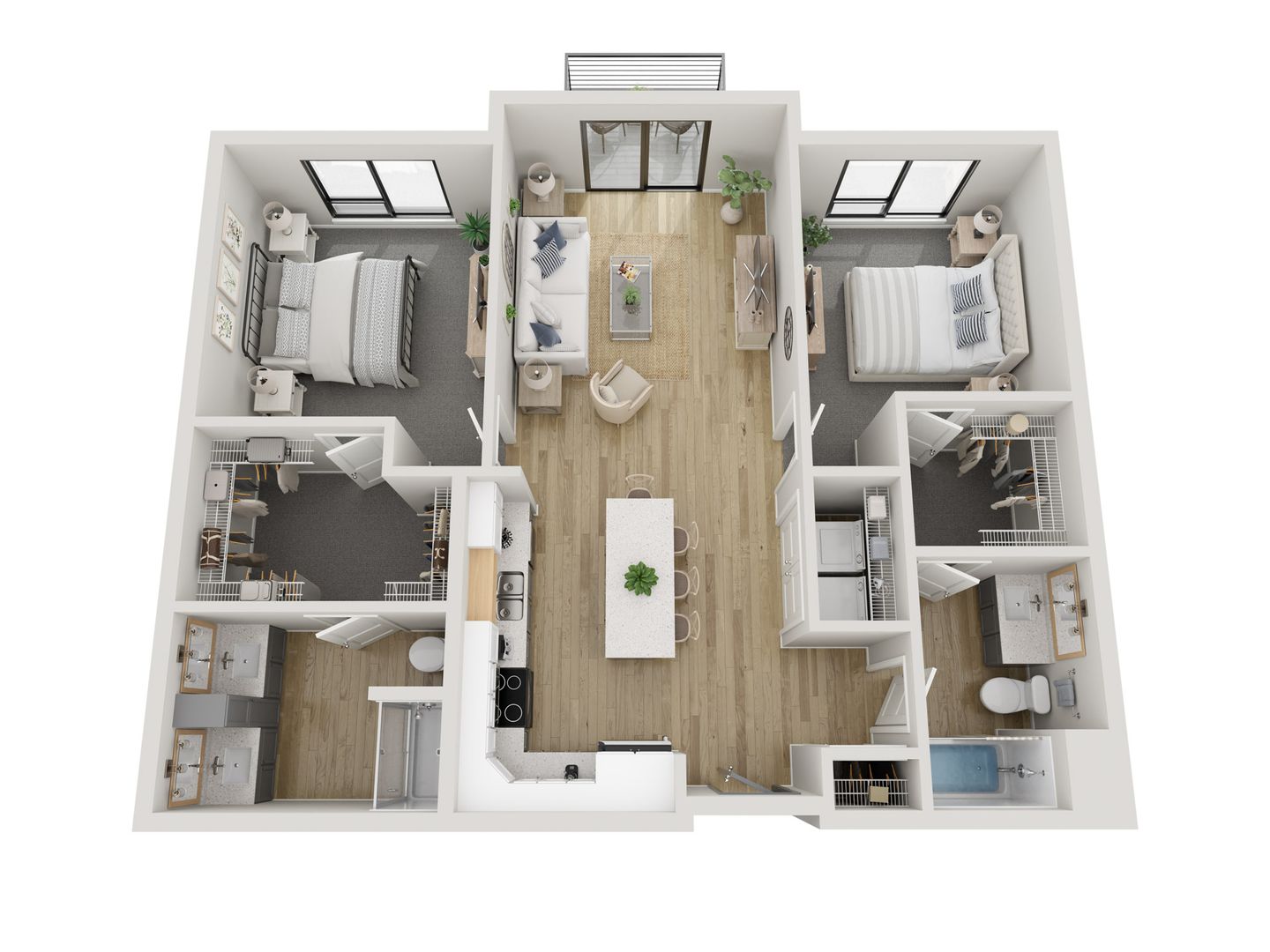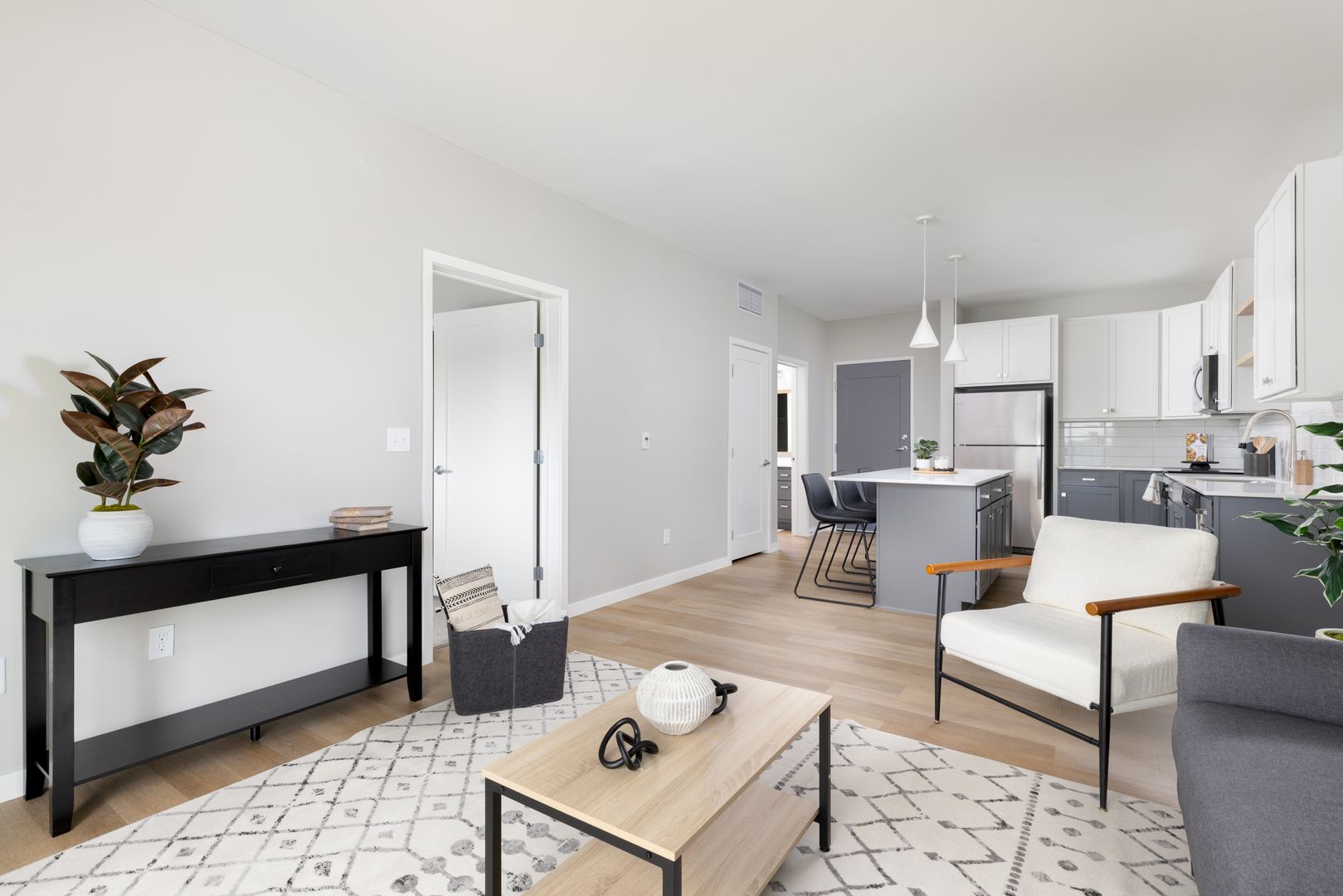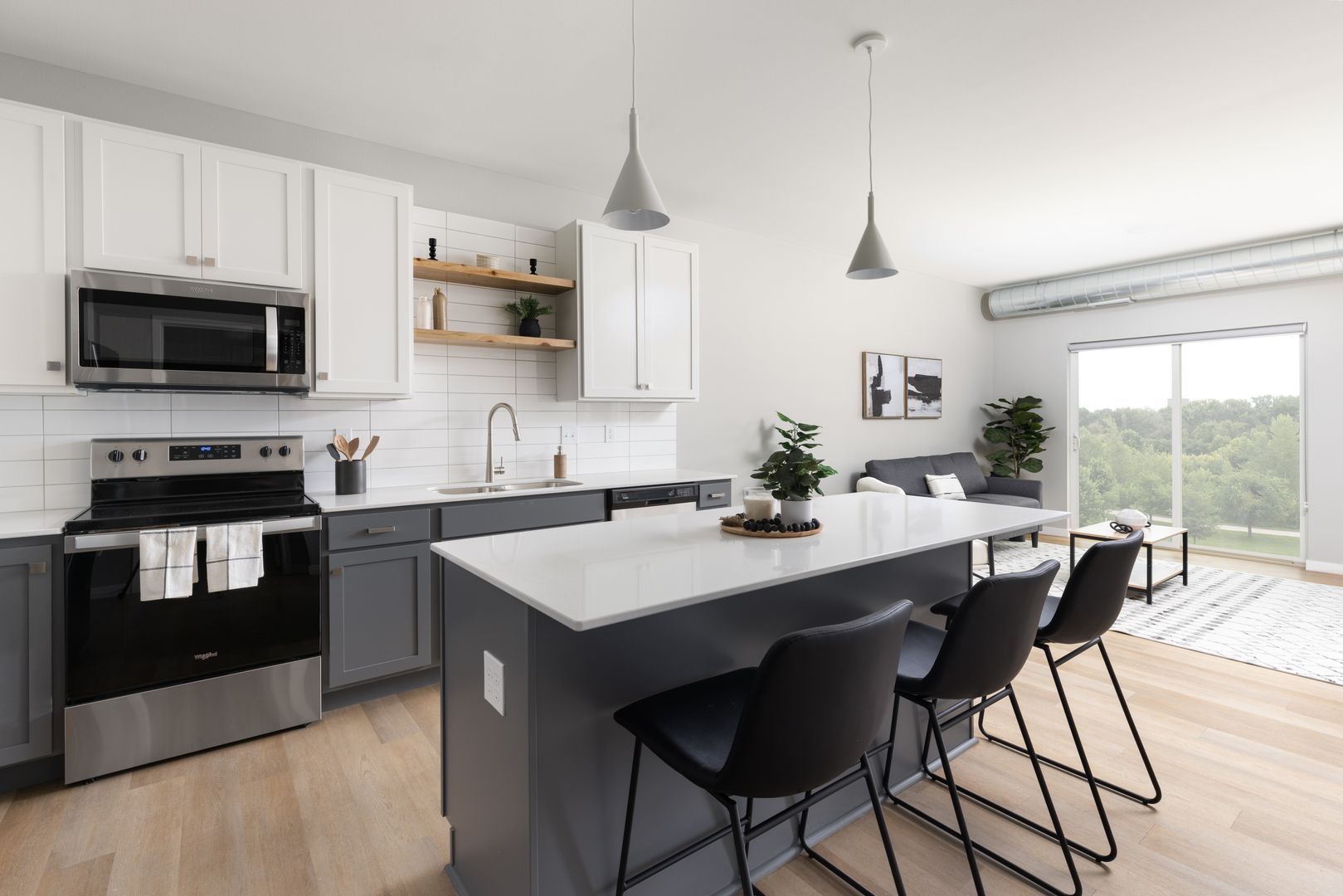 Wild Oak's studio, 1, 2, and 3-bedroom floor plans were expertly designed to maximize space. Each apartment home is filled with natural light, open-concept kitchens and in-home washer and dryer. Upgraded hand-picked finishes include-wood inspired flooring, tile backsplash, and quartz counters that create an upgraded living experience.