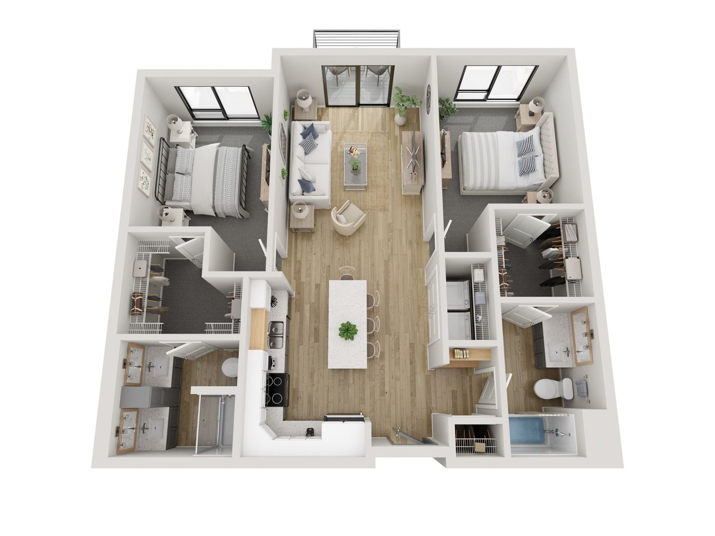 Wild Oak's studio, 1, 2, and 3-bedroom floor plans were expertly designed to maximize space. Each apartment home is filled with natural light, open-concept kitchens and in-home washer and dryer. Upgraded hand-picked finishes include-wood inspired flooring, tile backsplash, and quartz counters that create an upgraded living experience.